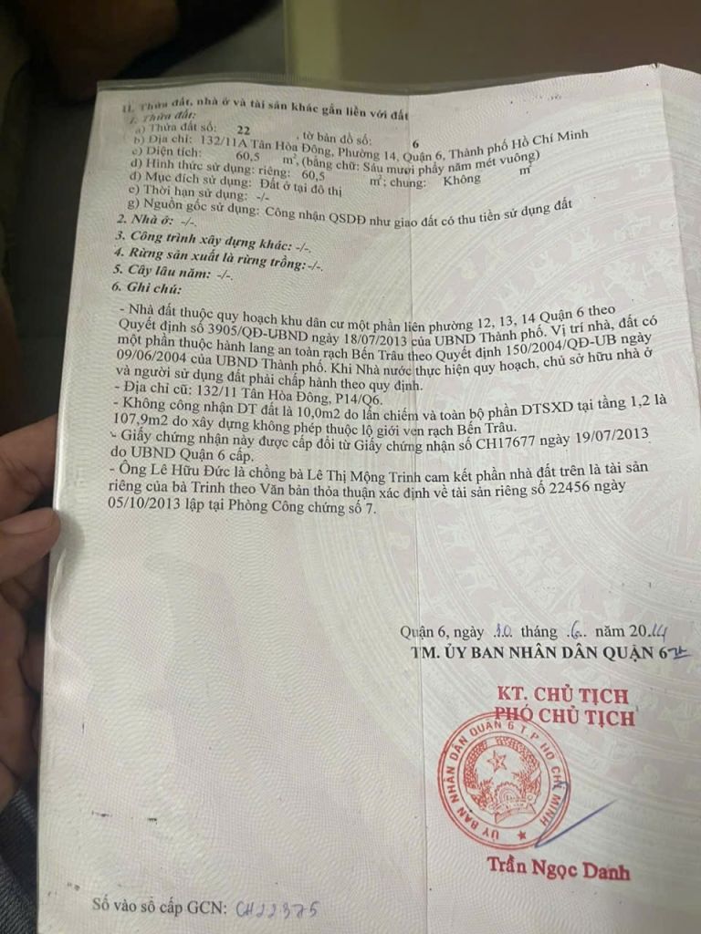 Bán nhà 132 Tân Hòa Đông phường 14 Quận 6 sát Phú Lâm tên lửa 4x15m chỉ 3tỷ6